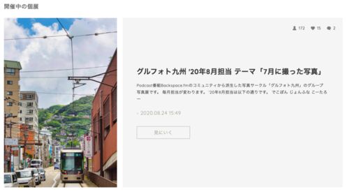 中の人が参加しているwebグループ写真展開催のお知らせです。 Podcast番組Backspace.fmのリスナーコミュニティから派生した九州グルドン民の写真部「グルフォト九州」。 2019/11/16の第1回MTGからスタートして遂にグループ展開催が出来ました。 こんな御時…